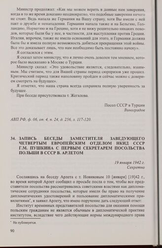 Запись беседы заместителя заведующего Четвертым Европейским отделом НКИД СССР Г.М. Пушкина с первым секретарем посольства Польши в СССР В. Арлетом. 19 января 1942 г.