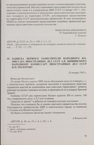 Записка первого заместителя народного комиссара иностранных дел СССР А.Я. Вышинского народному комиссару иностранных дел СССР В.М. Молотову. 20 января 1942 г. // АВП РФ, ф. 06, оп. 19, п. 8, д. 201, л. 4.