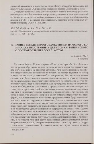 Запись беседы первого заместителя народного комиссара иностранных дел СССР А.Я. Вышинского с послом Польши в СССР С. Котом. 23 января 1942 г. // АВП РФ, ф. 06, оп. 4, п. 2, д. 22, л. 68-71. Опубл.: Документы и материалы по истории советско-польских отношений ... — Т. VII. - С. 282-284.