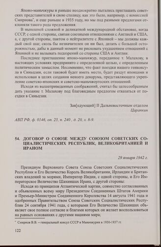 Договор о союзе между Союзом Советских Социалистических Республик, Великобританией и Ираном. 29 января 1942 г. // АВП РФ, ф. 36, оп. 1, п. 12, д. 147. Опубл.: Внешняя политика Советского Союза... — Т. 1. — С. 217-221.