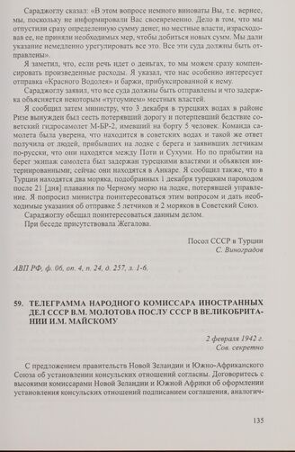 Телеграмма народного комиссара иностранных дел СССР В.М. Молотова послу СССР в Великобритании И.М. Майскому. 2 февраля 1942 г. // АВП РФ, ф. 059, оп. 1, п. 373, д. 2540, л. 52.