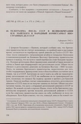 Главная Документы внешней политики СССР Документы внешней политики СССР. Т. XXV. 2 января-30 декабря 1942 г... Телеграмма посла СССР в Великобритании И.М. Майского в Народный ком...