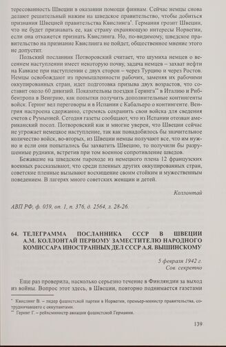 Телеграмма посланника СССР в Швеции А.М. Коллонтай первому заместителю народного комиссара иностранных дел СССР А.Я. Вышинскому. 5 февраля 1942 г.