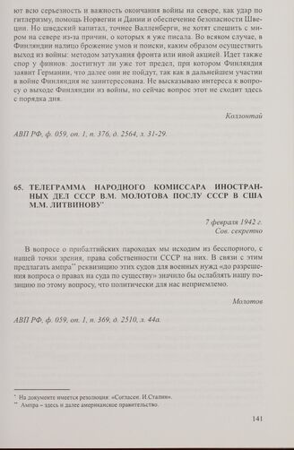 Телеграмма народного комиссара иностранных дел СССР В.М. Молотова послу СССР в США М.М. Литвинову. 7 февраля 1942 г.