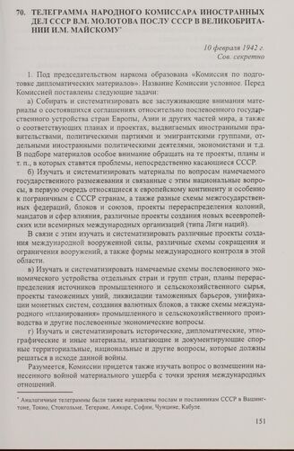 Телеграмма народного комиссара иностранных дел СССР В.М. Молотова послу СССР в Великобритании И.М. Майскому. 10 февраля 1942 г. // АВП РФ, ф. 059, оп. 1, п. 383, д. 2606, л. 36-38.