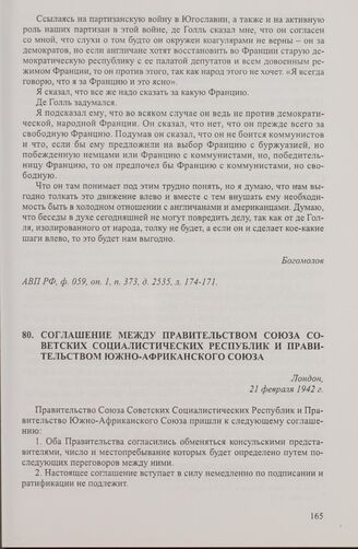 Соглашение между правительством Союза Советских Социалистических Республик и правительством Южно-Африканского Союза. 21 февраля 1942 г. // АВП РФ, ф. 3а, д. 1, л. 1. Опубл.: Россия и Африка. Документы и материалы. XVIII в. — I960 г. — М., 1999. — Т. II. — С. 103.