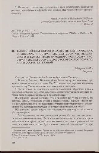 Запись беседы первого заместителя народного комиссара иностранных дел СССР А.Я. Вышинского и заместителя народного комиссара иностранных дел СССР С.А. Лозовского с послом Японии в СССР И. Татекавой. 23 февраля 1942 г. // АВП РФ, ф. 0146, оп. 25, п. 238, д. 5, л. 34-38.