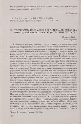 Телеграмма посла СССР в Турции С.А. Виноградова в Народный комиссариат иностранных дел СССР. 12 марта 1942 г. // АВП РФ, ф. 059, оп. 1, п. 366, д. 2492, л. 23-27.