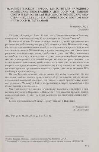 Запись беседы первого заместителя народного комиссара иностранных дел СССР А.Я. Вышинского и заместителя народного комиссара иностранных дел СССР С.А. Лозовского с послом Японии в СССР И. Татекавой. 19 марта 1942 г. // АВП РФ, ф. 0146, оп. 25, п. 238, д. 5, л. 65.