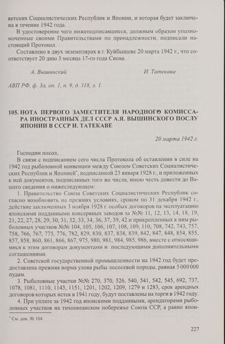 Нота первого заместителя народного комиссара иностранных дел СССР А.Я. Вышинского послу Японии в СССР И. Татекаве. 20 марта 1942 г. // АВП РФ, ф. 3а, оп. 1, п. 9, д. 119, л. 1-3.