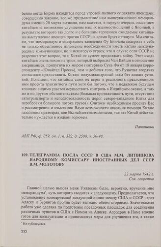 Телеграмма посла СССР в США М.М. Литвинова народному комиссару иностранных дел СССР В.М. Молотову. 22 марта 1942 г.