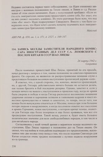 Запись беседы заместителя народного комиссара иностранных дел СССР С.А. Лозовского с послом Китая в СССР Шао Лицзы. 24 марта 1942 г. // АВП РФ, ф. 0100, оп. 29, п. 204, д. 9, л. 6-11.