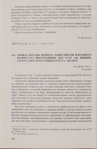 Запись беседы первого заместителя народного комиссара иностранных дел СССР А.Я. Вышинского с послом Турции в СССР А. Актаем. 24 марта 1942 г. // АВП РФ, ф. 06, оп. 4, п. 2, д. 23, л. 73-76.