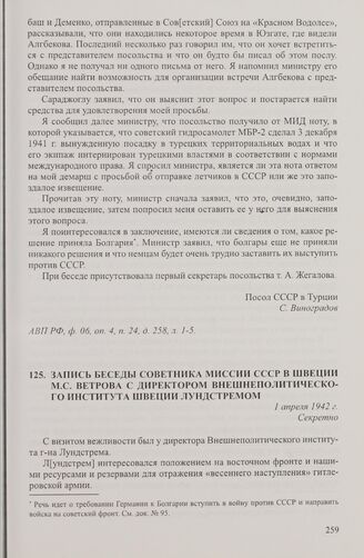 Запись беседы советника миссии СССР в Швеции М.С. Ветрова с директором Внешнеполитического института Швеции Лундстремом. 1 апреля 1942 г. // АВП РФ, ф. 0140, оп. 26, п. 125, д. 13, л. 40-42.