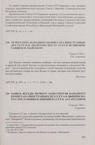 Запись беседы первого заместителя народного комиссара иностранных дел СССР А.Я. Вышинского с посланником Швеции в СССР В. Ассарссоном. 6 апреля 1942 г. // АВП РФ, ф. 06, оп. 4, п. 2, д. 24, л. 11-13.