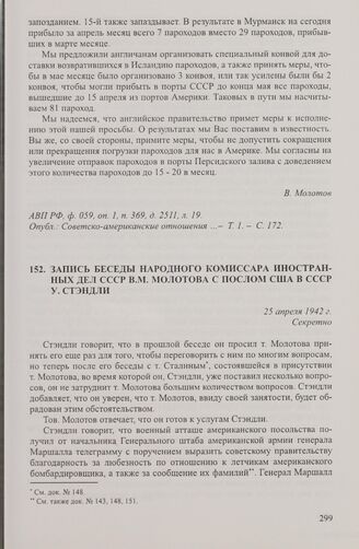 Запись беседы народного комиссара иностранных дел СССР В.М. Молотова с послом США в СССР У. Стэндли. 25 апреля 1942 г. // АВП РФ, ф. 06, оп. 4, п. 1, д. 12, л. 63-67.