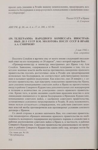 Телеграмма народного комиссара иностранных дел СССР В.М. Молотова послу СССР в Иране А.А. Смирнову. 2 мая 1942 г. // АВП РФ, ф. 059, оп. 1, п. 378, д. 2580, л. 128-130.