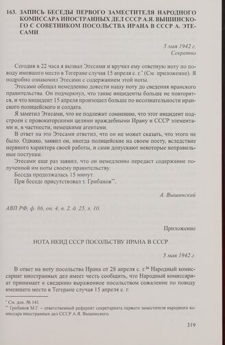 Запись беседы первого заместителя народного комиссара иностранных дел СССР А.Я. Вышинского с советником посольства Ирана в СССР А. Этесами. 5 мая 1942 г. // АВП РФ, ф. 06, оп. 4, п. 2, д. 25, л. 10.
