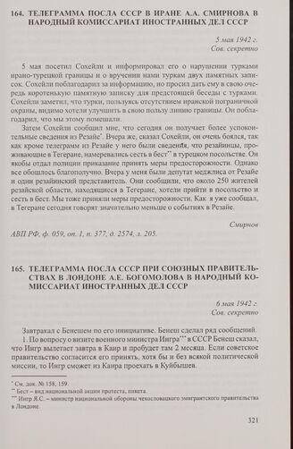 Телеграмма посла СССР в Иране А.А. Смирнова в Народный комиссариат иностранных дел СССР. 5 мая 1942 г. // АВП РФ, ф. 059, оп. 1, п. 377, д. 2574, л. 205.