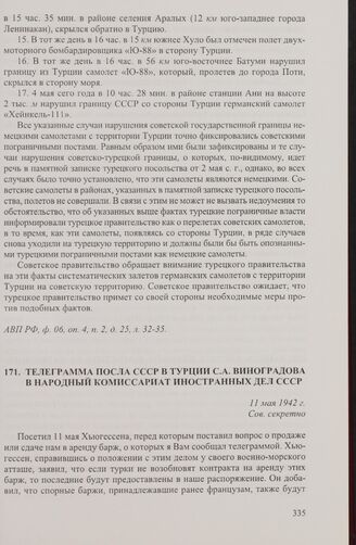 Главная Документы внешней политики СССР Документы внешней политики СССР. Т. XXV. 2 января-30 декабря 1942 г... Телеграмма посла СССР в Турции С.А. Виноградова в Народный комиссар...
