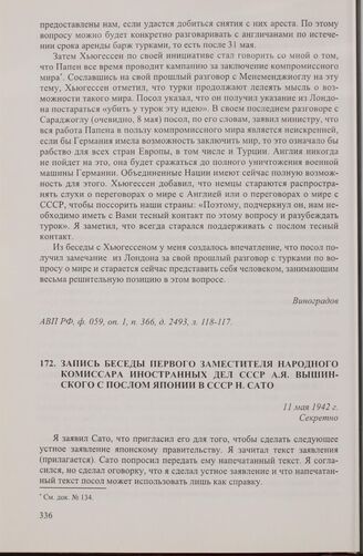 Запись беседы первого заместителя народного комиссара иностранных дел СССР А.Я. Вышинского с послом Японии в СССР Н. Сато. 11 мая 1942 г. // АВП РФ, ф. 06, оп. 4, п. 2, д. 25, л. 36-39.