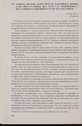 Запись беседы заместителя народного комиссара иностранных дел СССР С.А. Лозовского с посланником Швеции в СССР В. Ассарссоном. 13 мая 1942 г. // АВП РФ, ф. 06, оп. 4, п. 3, д. 32, л. 56-58.