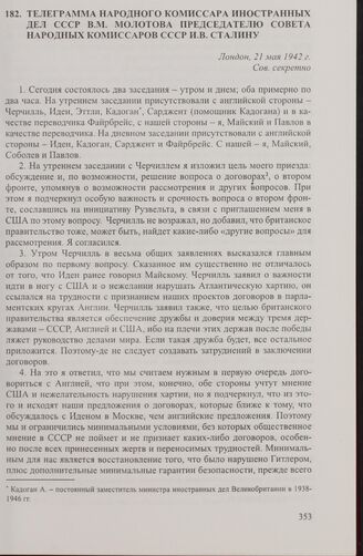 Телеграмма народного комиссара иностранных дел СССР В.М. Молотова председателю Совета народных комиссаров СССР И.В. Сталину. 21 мая 1942 г. // АВП РФ, ф. 059, оп. 1, п. 382, д. 2604, л. 115-120. Опубл. с сокр.: СССР и германский вопрос ... — Т. 1. — С. 159-161.