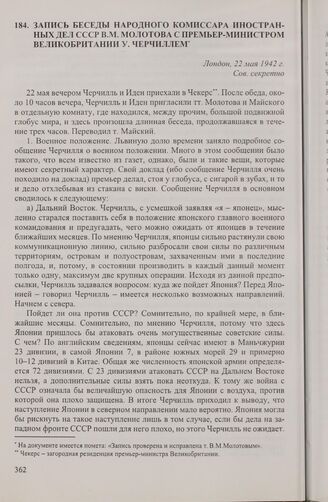 Запись беседы народного комиссара иностранных дел СССР В.М. Молотова с премьер-министром Великобритании У. Черчиллем. Лондон, 22 мая 1942 г.