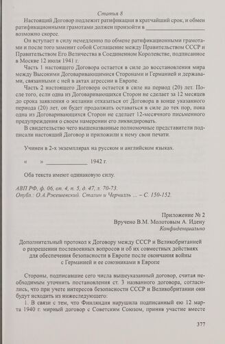 Приложение к записи беседы народного комиссара иностранных дел СССР В.М. Молотова с министром иностранных дел Великобритании А. Иденом от 23 мая 1942 г. Дополнительный протокол к Договору между СССР и Великобританией о разрешении послевоенных вопросов и об их совместных действиях для обеспечения безопасности в Европе после окончания войны с Германией и ее союзниками в Европе // АВП РФ, ф. 06, оп. 4, п. 5, д. 4 7, л. 74-75. Опубл.: О.А. Ржешевский. Сталин и Черчилль ... — С. 149-150.