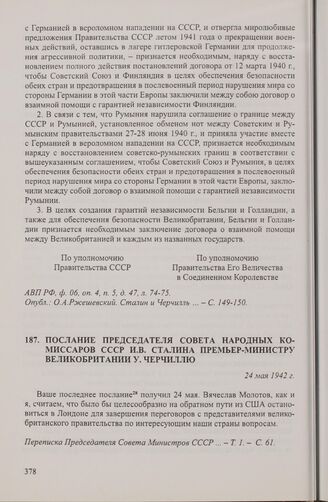 Послание председателя Совета народных комиссаров СССР И.В. Сталина премьер-министру Великобритании У. Черчиллю. 24 мая 1942 г. // Переписка Председателя Совета Министров СССР ... — Т. 1. — С. 61.