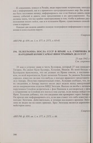 Телеграмма посла СССР в Иране А.А. Смирнова в Народный комиссариат иностранных дел СССР. 25 мая 1942 г. // АВП РФ, ф. 059, оп. 1, п. 377, д. 2575, л. 66.
