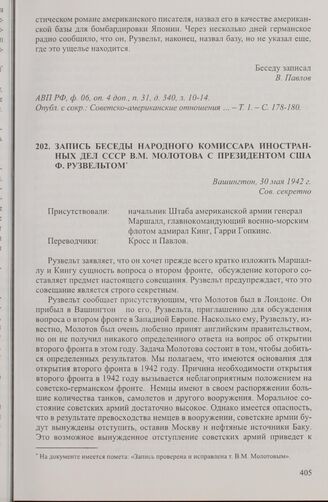 Запись беседы народного комиссара иностранных дел СССР В.М. Молотова с президентом США Ф. Рузвельтом. Вашингтон, 30 мая 1942 г. // АВП РФ, ф. 06, оп. 4 доп., п. 31, д. 340, л. 17-25. Опубл.: Советско-американские отношения ... — Т. 1. — С. 181-187.