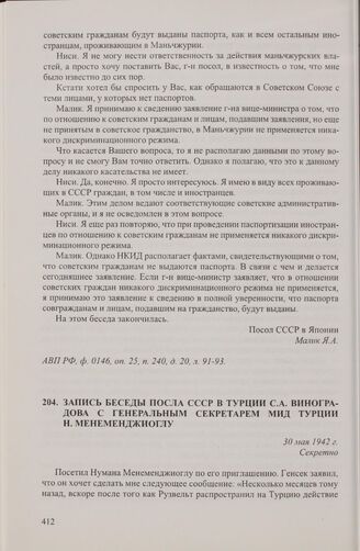 Запись беседы посла СССР в Турции С.А. Виноградова с генеральным секретарем МИД Турции Н. Менеменджиоглу. 30 мая 1942 г. // АВП РФ, ф. 06, оп. 4, п. 24, д. 258, л. 170-175.