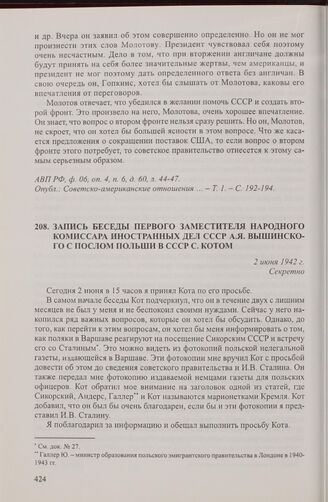 Запись беседы первого заместителя народного комиссара иностранных дел СССР А.Я. Вышинского с послом Польши в СССР С. Котом. 2 июня 1942 г. // АВП РФ, ф. 06, оп. 4, п. 2, д. 26, л. 6-13.