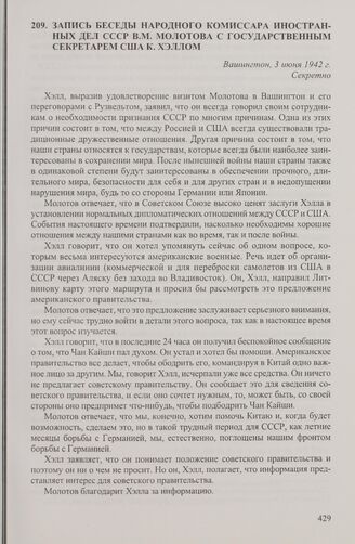 Запись беседы народного комиссара иностранных дел СССР В.М. Молотова с государственным секретарем США К. Хэллом. Вашингтон, 3 июня 1942 г. // АВП РФ, ф. 06, оп. 4, п. 6, д. 60, л. 48-51. Опубл.: Советско-американские отношения ... — Т. 1. — С. 195-197.
