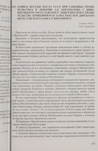 Запись беседы посла СССР при союзных правительствах в Лондоне А.Е. Богомолова с вице-премьером югославского эмигрантского правительства Крниевичем и заместителем директора югославского банка Р. Бичаничем. 5 июня 1942 г.