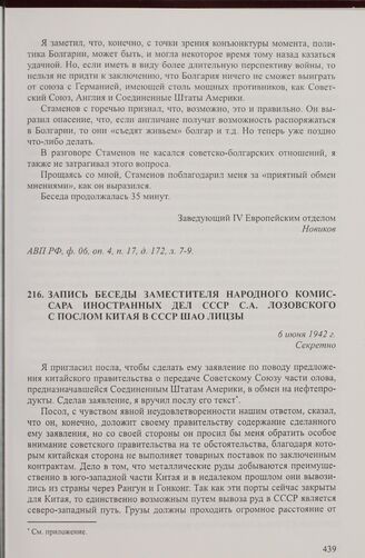 Запись беседы заместителя народного комиссара иностранных дел СССР С.А. Лозовского с послом Китая в СССР Шао Лицзы. 6 июня 1942 г. // АВП РФ, ф. 0100, оп. 29, п. 204, д. 9, л. 17-23.