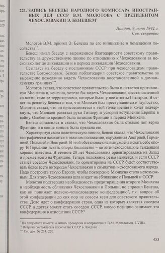 Запись беседы народного комиссара иностранных дел СССР В.М. Молотова с президентом Чехословакии Э. Бенешем. Лондон, 9 июня 1942 г. // АВП РФ, ф. 06, оп. 4, п. 5, д. 48, л. 13-16. Опубл. с сокр: Документы и материалы по истории советско-чехословацких отношений ... — Т. 4. — Кн. 1. — С. 228-229.