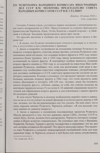 Телеграмма народного комиссара иностранных дел СССР В.М. Молотова председателю Совета народных комиссаров СССР И В. Сталину. Лондон, 10 июня 1942 г. // АВП РФ, ф. 059, оп. 1, п. 382, д. 2604, л. 9-15. Опубл.: Советско-английские отношения... — Т. 1. — С. 244-247.