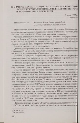 Запись беседы народного комиссара иностранных дел СССР В.М. Молотова с премьер-министром Великобритании У. Черчиллем. 10 июня 1942 г. // АВП РФ, ф. 06, оп. 4, п. 5, д. 47, л. 138-140. Опубл: О.А. Ржешевский. Сталин и Черчилль ... — С. 335-337.