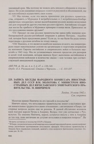 Запись беседы народного комиссара иностранных дел СССР В.М. Молотова с министром иностранных дел югославского эмигрантского правительства М. Нинчичем. Лондон, 10 июня 1942 г. // АВП РФ, ф. 06, оп. 4, п. 5, д. 51, л. 21-22.