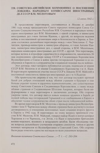 Советско-английское коммюнике о посещении Лондона народным комиссаром иностранных дел СССР В.М. Молотовым. 12 июня 1942 г. // Внешняя политика Советского Союза ... — Т. 1. — С. 283-284.