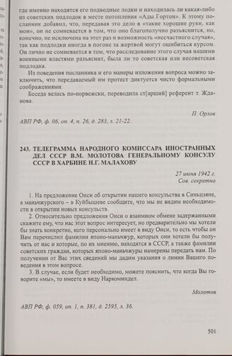 Телеграмма народного комиссара иностранных дел СССР В.М. Молотова генеральному консулу СССР в Харбине Н.Г. Малахову. 27 июня 1942 г. // АВП РФ, ф. 059, оп. 1, п. 381, д. 2595, л. 36.