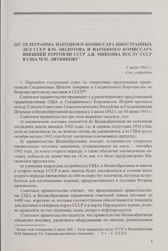 Телеграмма народного комиссара иностранных дел СССР В.М. Молотова и народного комиссара внешней торговли СССР А.И. Микояна послу СССР в США М.М. Литвинову. 1 июля 1942 г. // АВП РФ, ф. 059, оп. 1, п. 369, д. 2511, л. 110-111. Опубл.: Советско-американские отношения ... — Т. 1. — С. 208-209.