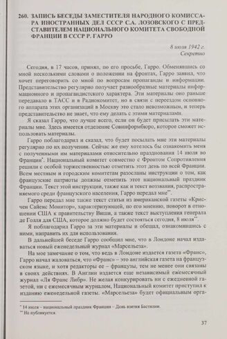 Запись беседы заместителя народного комиссара иностранных дел СССР С.А. Лозовского с представителем Национального комитета Свободной Франции в СССР Р. Гарро. 8 июля 1942 г. // АВП РФ, ф. 06, оп. 4, п. 3, д. 33, л. 14-16.
