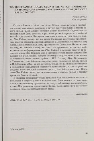 Телеграмма посла СССР в Китае А.С. Панюшкина народному комиссару иностранных дел СССР В.М. Молотову. 9 июля 1942 г. // АВП РФ, ф. 059, оп. 1, п. 382, д. 2598, л. 166-165.