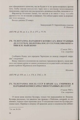 Телеграмма народного комиссара иностранных дел СССР В.М. Молотова послу СССР в Великобритании И.М. Майскому. 15 июля 1942 г. // АВП РФ, ф. 059, оп. 1, п. 374, д. 2542, л. 34.