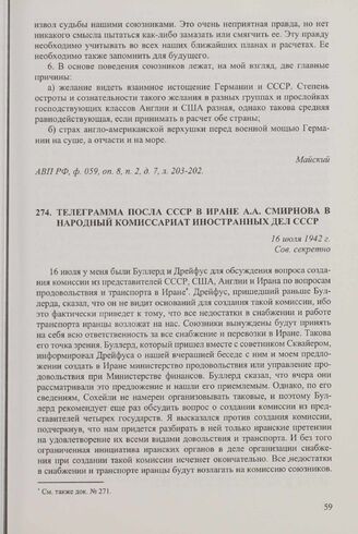 Телеграмма посла СССР в Иране А.А. Смирнова в Народный комиссариат иностранных дел СССР. 16 июля 1942 г. // АВП РФ, ф. 059, оп. 1, п. 378, д. 2576, л. 89-86.