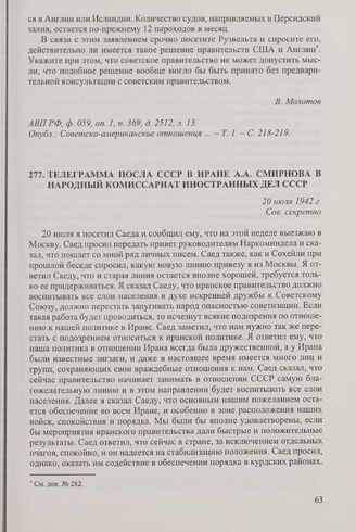 Телеграмма посла СССР в Иране А.А. Смирнова в Народный комиссариат иностранных дел СССР. 20 июля 1942 г. // АВП РФ, ф. 059, оп. 1, п. 378, д. 2576, л. 115-113.