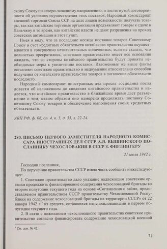 Письмо первого заместителя народного комиссара иностранных дел СССР А.Я. Вышинского посланнику Чехословакии в СССР З. Фирлингеру. 21 июля 1942 г.